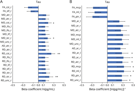 (一)同一时间关联。(B)联系早期τ和后来的扩散张量成像(DTI)指标。总τ水平在血液里自然对数转换为偏态调整,和价值观的DTI白质束的指标标准化。蓝色酒吧表示β系数的关联mixed-effects模型与随机拦截时间调整后,性,并在未修正的网站p< 0.05。误差线表示β系数的标准误差。星号*表示0.05 <pFDR-adjusted< 0.1,星号* *表示pFDR-adjusted< 0.05。DTI指标:FA =分数各向异性;MD =平均扩散系数;广告=轴向扩散系数;和RD =径向扩散系数。缩写白质束在方法部分,列出了分段概率Tractography科目的兴趣和eFigure 1 (links.lww.com/WNL/C812)。“_l”表示左半球和“_r”表示右脑。