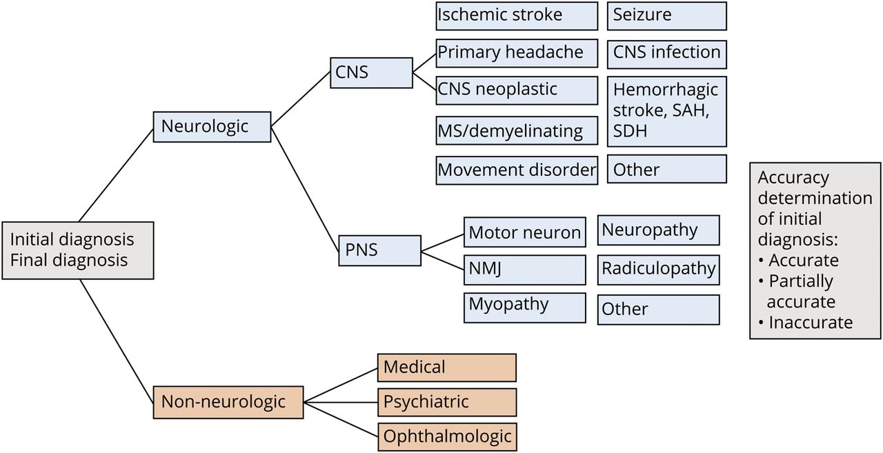回顾性研究进行了分类情况,确定居民首次诊断的准确性。初始印象和最后诊断分别分类根据预定的定位和诊断途径,旨在区分错误的本地化的疾病状态(病因)。我们的分类方案中所示图1描述如下:最初的印象和最后的诊断被认为是神经或non-neurologic和神经病例按定位为中枢神经系统或周围神经系统(pn)和进一步subcategorized病因。神经系统疾病的病因我们意愿特定类别;中枢神经系统中列出的病因表,中枢神经系统不是另有规定(NOS)用于更复杂的情况下,不符合一个类别(如自身免疫性脑炎,后部可逆性脑病综合征)。pn分类列出表,包括pn NOS(主要是周围性眩晕)。Non-neurologic病例进一步划分为医疗、精神或眼科。频率、手段和SDs特定的本地化的计算。