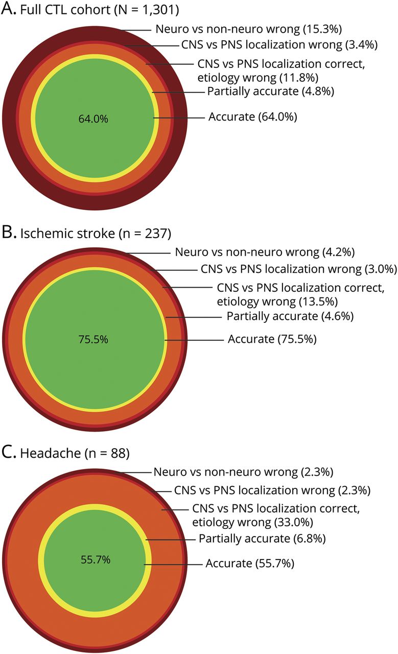 居民准确性描述为目标,与度显示的准确性越来越偏离。准确诊断所示绿色;在黄色部分准确;和错误的诊断,橙色和红色所示。错误的诊断分为错误诊断途径,不同阶段的错误区分non-neurologic神经疾病由最外层的戒指。完整的细胞毒性t淋巴细胞(A)精度目标队列(n = 1301)。(B)缺血性中风病例(n = 237)。(C)头痛病例(n = 88)。pn =周围神经系统。