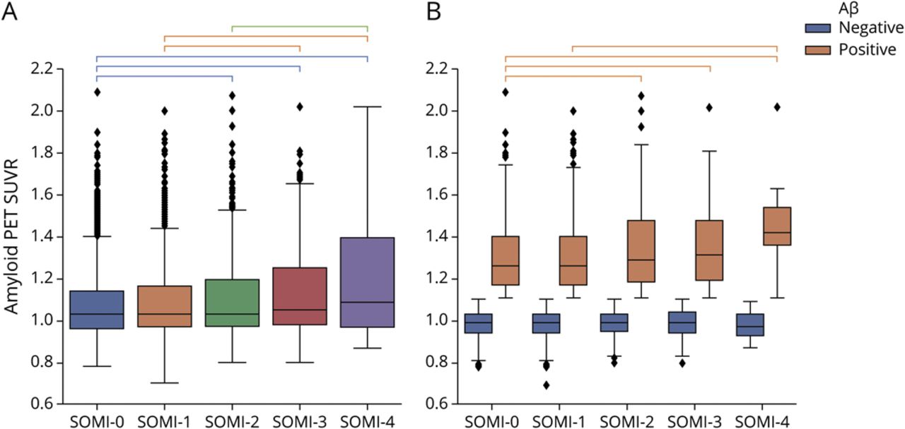 在整个样本协方差分析表明,个体在高等SOMI阶段有更高的全球SUVR淀粉样蛋白(F= 8.4,p< 0.001)。具体地说,那些在SOMI-4高淀粉样比SOMI-0 SUVR, 1和2 (p< 0.001)个人在SOMI-3淀粉样比SOMI-0 SUVR(较高p< 0.001)和SOMI-1 (p= 0.003)。个人之间没有区别淀粉样SUVR SOMI-0 SOMI-1。(图1一个)。分层样品到Aβ−和Aβ+子组评估阈下和阈上的淀粉样蛋白SUVR SOMI阶段之间的区别。在阈下的水平(Aβ−),淀粉样SUVR SOMI阶段之间没有明显不同。超阈值的水平(Aβ+),这些在SOMI-4淀粉样SUVR高于个人SOMI-0 (p< 0.001)和SOMI-1 (p= 0.002),这些在SOMI-2 SOMI-3阶段和高淀粉样比SOMI-0 SUVR (p= 0.002)(图1 b)。